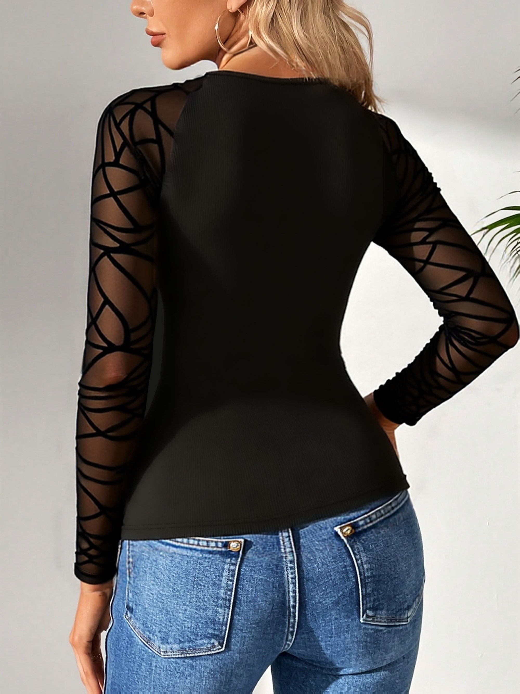 ' Slim Fit Mesh Panel Pullover Shirt - Solid Color Round Neck Long Sleeve Blouse, Medium-Stretch Casual Tunic Top for Spring/Autumn Layering, Machine Washable Solid Color Shirt (No undergarment Padding)